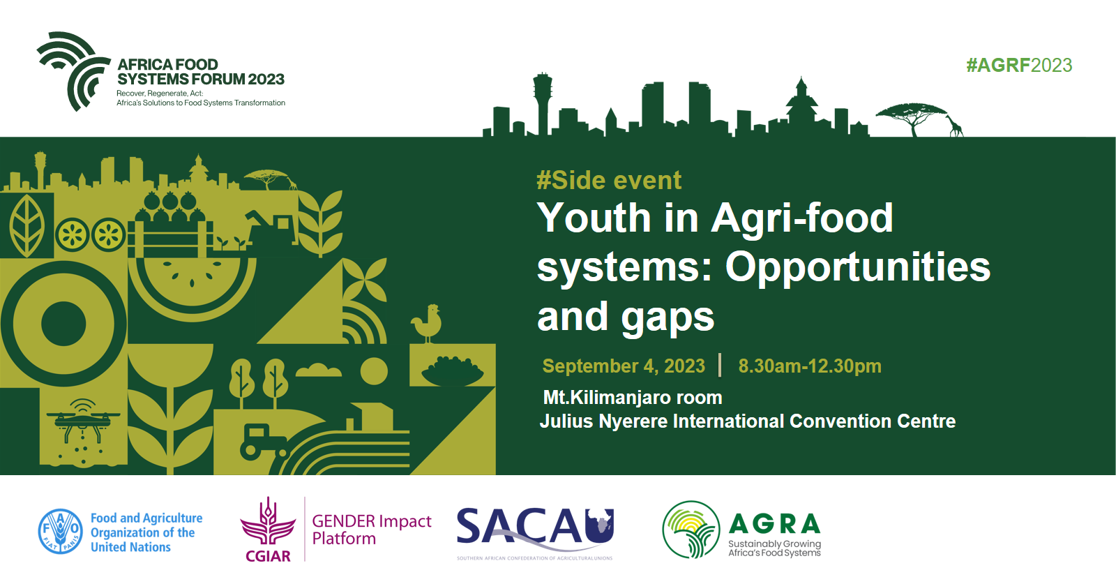 The CGIAR GENDER Impact Platform is co-organizing a side event to explore opportunities and gaps for young women and men farmers in agrifood systems. The event is co-organized with Food and Agriculture Organization of the United Nations (FAO), Southern African Confederation of Agricultural Unions (SACAU) and Alliance for Green Revolution in Africa (AGRA).
