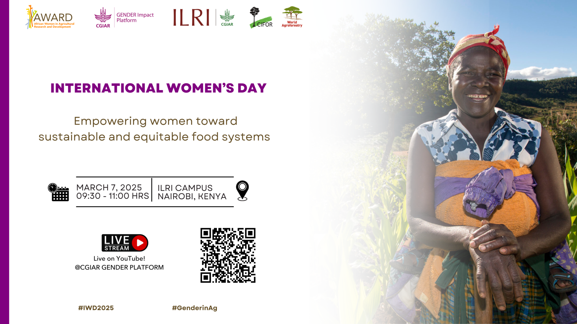 The CGIAR Gender Equality and Inclusion Accelerator and African Women in Agricultural Research and Development (AWARD) are convening an event together with the International Livestock Research Institute (ILRI) and CIFOR-ICRAF to mark the International Women's Day 2025. The event will be held on 7 March, 2025 from 9.30-11.00 am and streamed via YouTube channel.