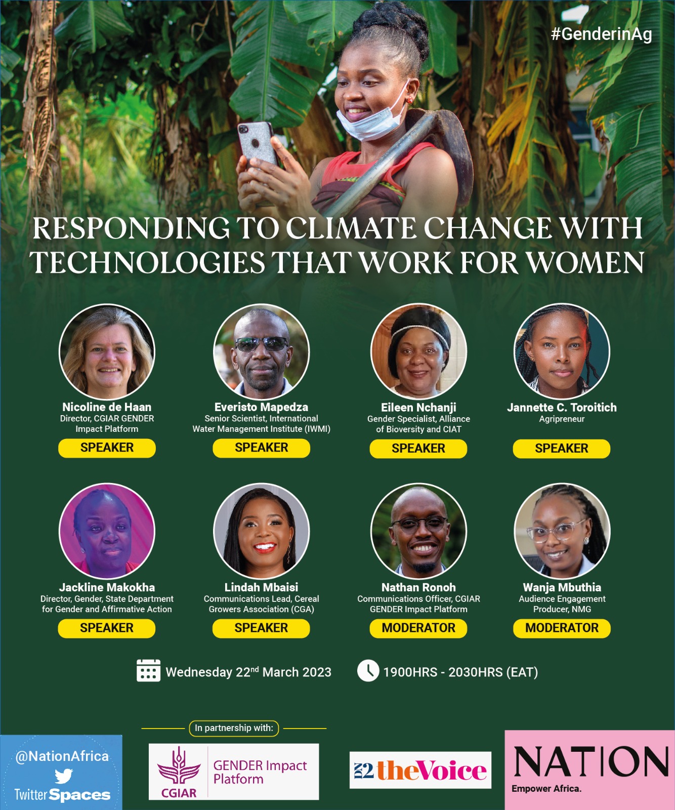 On World Water Day, March 22, the CGIAR GENDER Impact Platform is partnering with Nation Africa to host a Twitter Spaces event to explore how science, innovation and technologies can support women farmers to respond to climate change impacts.