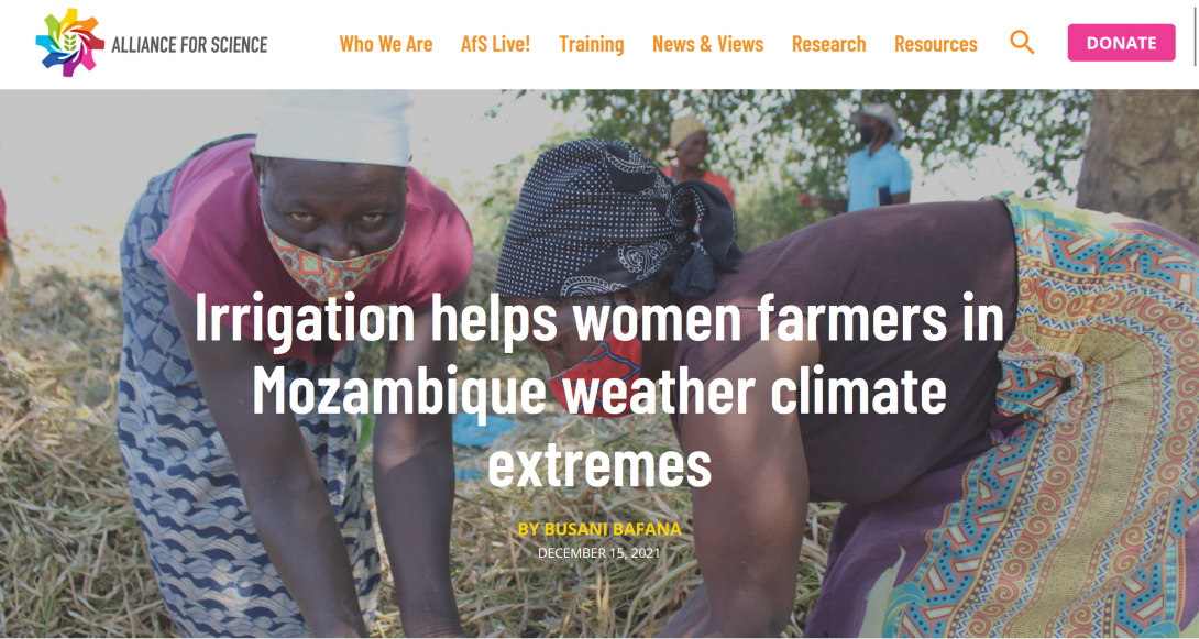 Bafana, Busani. 2021. “Irrigation Helps Women Farmers in Mozambique Weather Climate Extremes.” Alliance for Science. December 15, 2021. https://allianceforscience.cornell.edu/blog/2021/12/irrigation-helps-women-farmers-in-mozambique-weather-climate-extremes/.