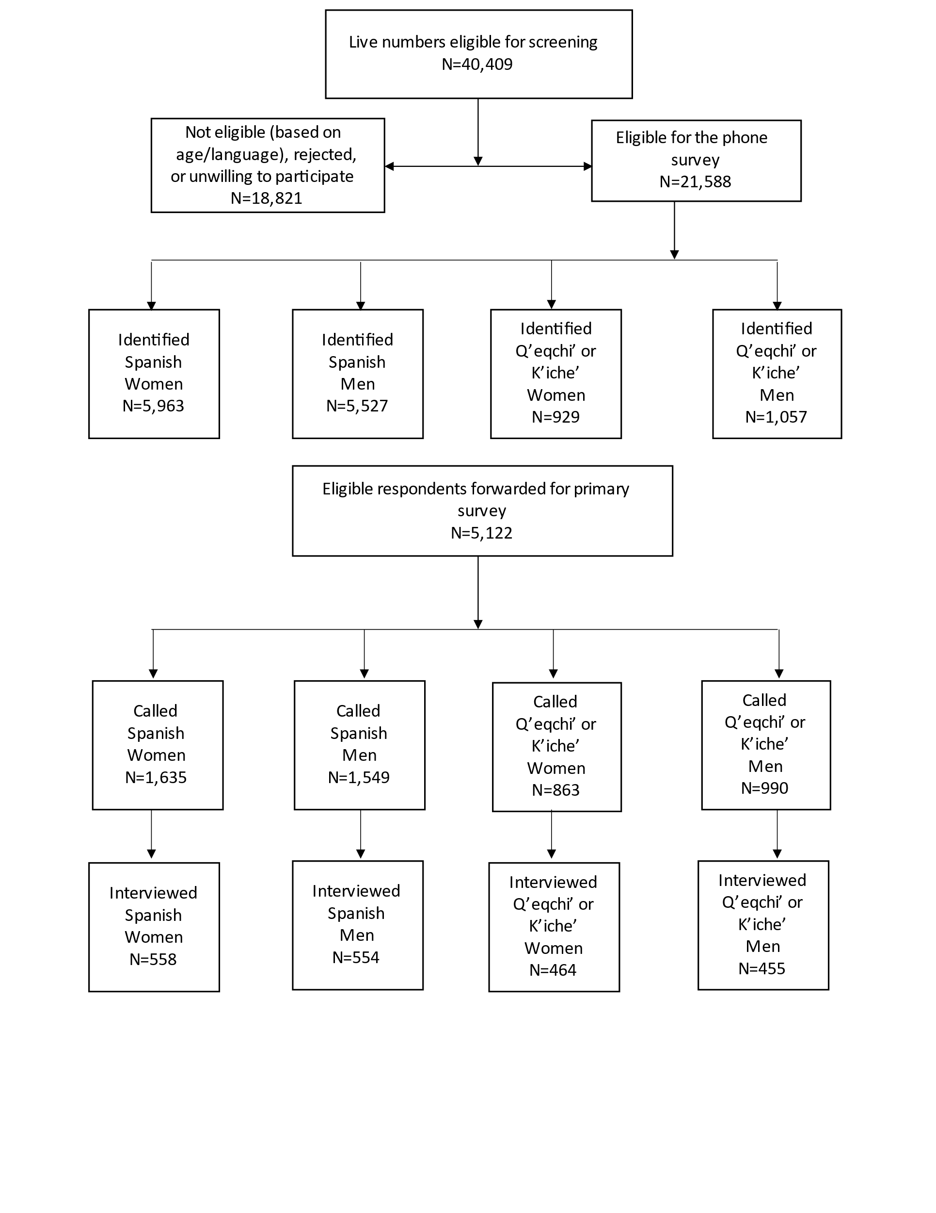 In our case, we also needed to consider that only around nine percent of the population would speak K’iche’ or Q’eqchi’ as a first language, and that these people may have lower rates of phone ownership and less consistent access to mobile phone networks. Therefore, we could not rely on random digit-dialing approaches to identify our target sample of K’iche’ or Q’eqchi’ speakers.