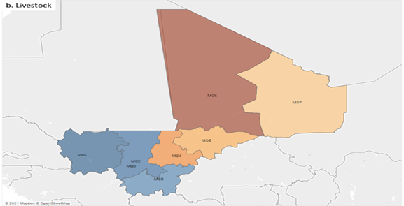 For instance, the subnational mapping for Mali reveals that Tombouctou Region in northern Mali is a hotspot for livestock (figure 3), suggesting that women engaged in livestock keeping are experiencing high climate risk, which is corroborated by other evidence. Tombouctou region is characterized by a pastoralist livestock economy and is experiencing increasingly warm and (extended) dry weather. Women in pastoralist livelihoods in the Sahel contribute a large share of labor to livestock keeping, even if they are less likely to control livestock. Women in Toumbouctou are subject to restrictive norms and roles hindering their mobility and their access to resources, services and diversified livelihoods. They face heavy domestic and care workloads, along with increasing productive workloads because of male outmigration.
