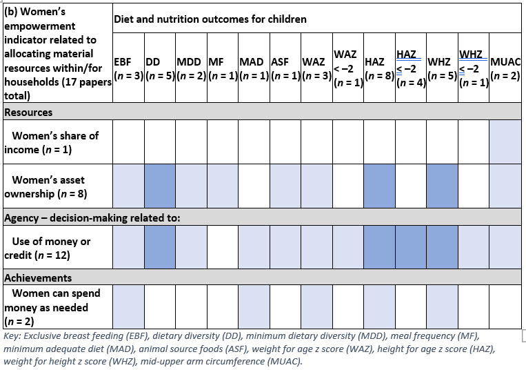 The authors produced five sets of tables generated from the analysis reflected in the example above. They show a focus on linking women’s empowerment with dietary diversity, especially for women. For children, there is also a focus on linking various aspects of women’s empowerment with anthropometric outcomes, such as children’s height for age or weight for height. Only one study looked at the relationships between aspects of women’s empowerment and micronutrient status.