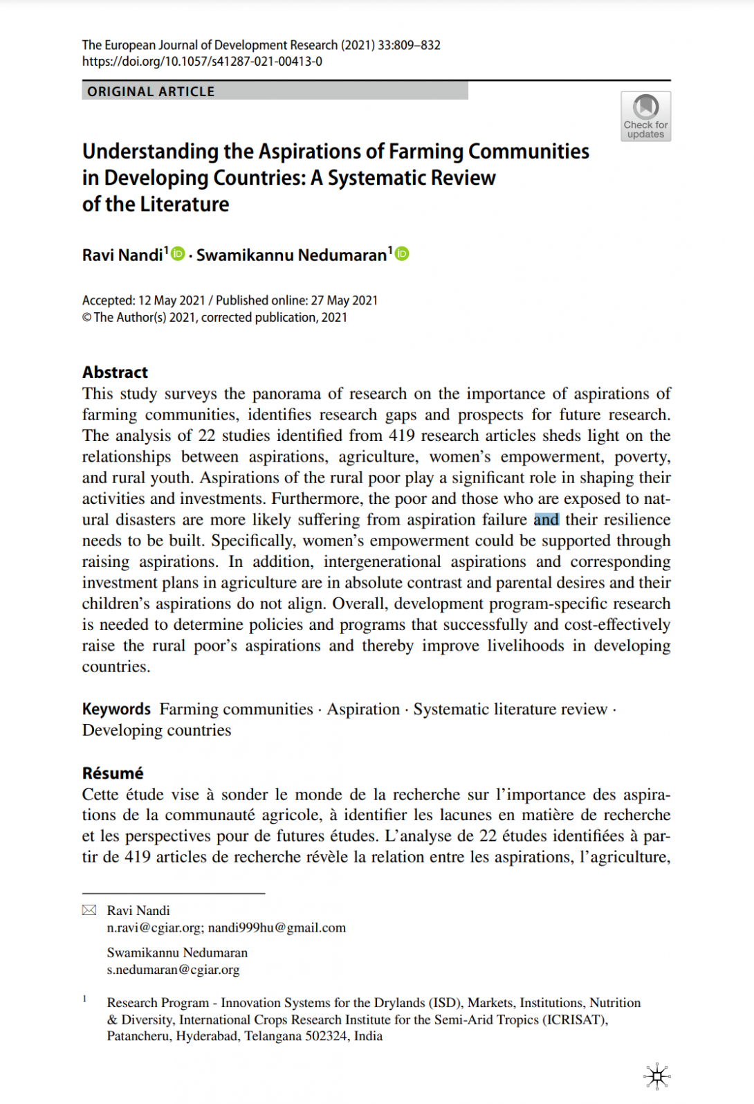 Nandi, R., Nedumaran, S. Understanding the Aspirations of Farming Communities in Developing Countries: A Systematic Review of the Literature. Eur J Dev Res 33, 809–832 (2021).