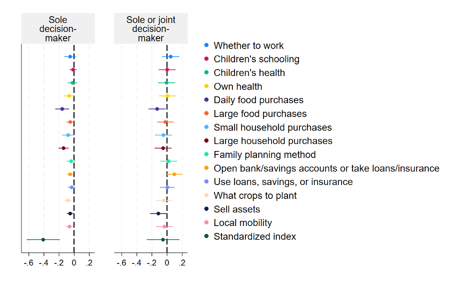 These results show that priming can affect measures of decision-making power. The statistically significant effects, reported in Figure 1, translate into percentage changes ranging from 52 percent (i.e., about daily food purchases) to 89 percent (i.e., about what crops to plant). Therefore, although our treatment is subtle—representing simply changing the order of two questions on our survey—we estimate priming effects with meaningful magnitudes.