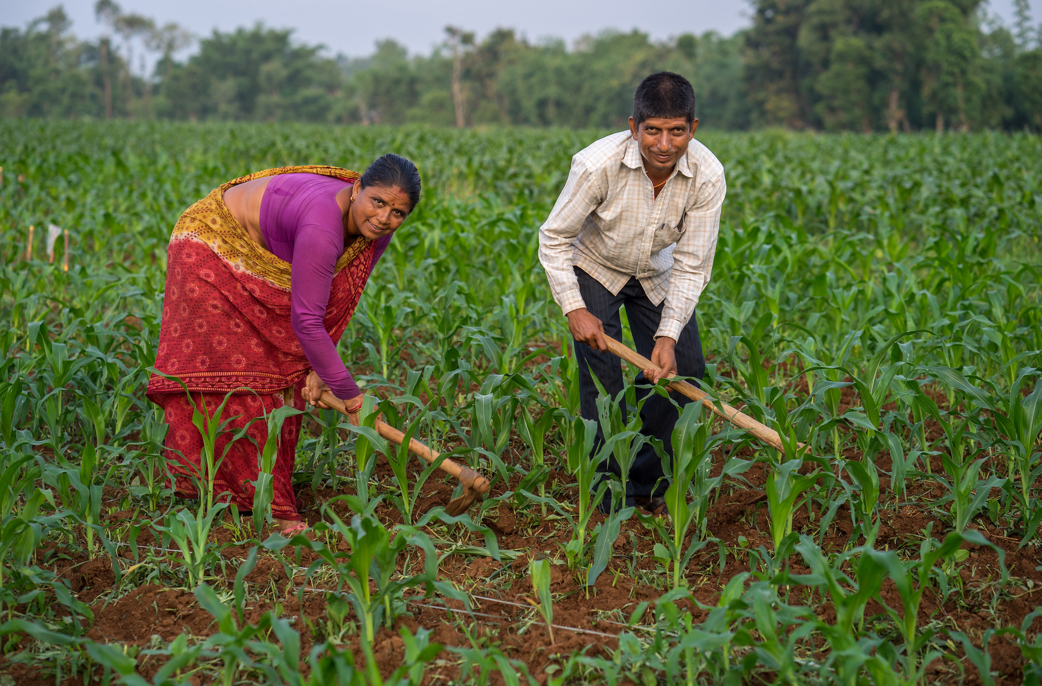 A couple, Megrhraj and Voma Neupane, weed their maize field. (Photo: P. Lowe/CIMMYT)