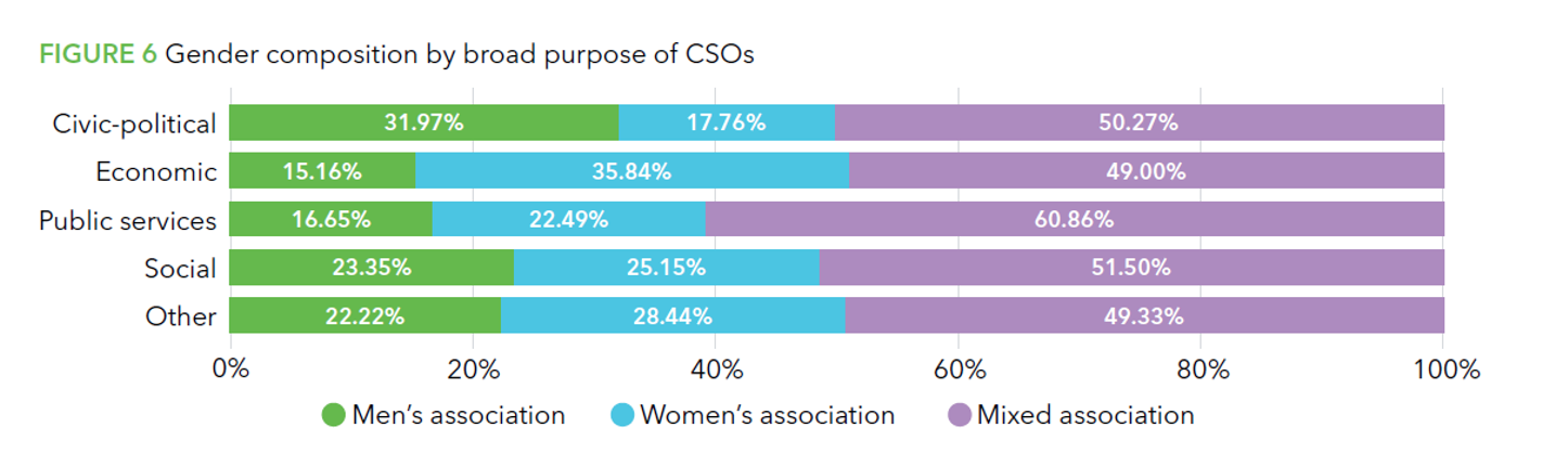 For each of the five purpose categories, there are more all-female CSOs with that purpose than all-male CSOs, with one significant exception: For civic-political groups, 32% are men’s CSOs, while only 18% are women’s CSOs, and the remaining half are mixed gender CSOs (Figure 6). Women’s groups are less likely to engage in politics, which mirrors other findings pointing to a pervasive gender gap in nearly all forms of political participation.